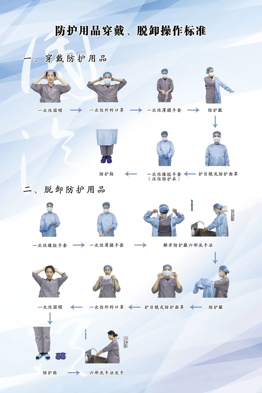 4、一次性防護用品不得重復使用;重復使用的各類防護用品使用后要清洗消毒處理。
