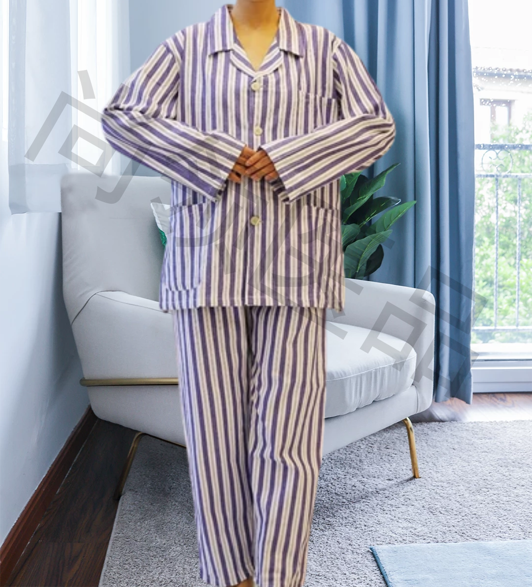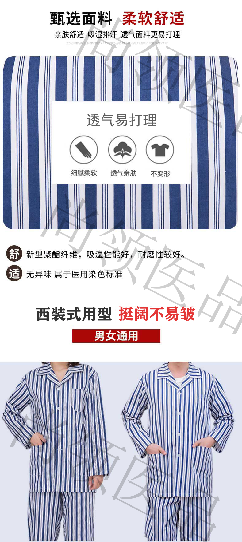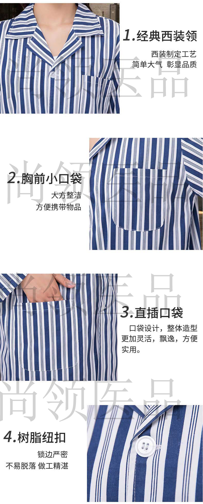 藍白條紋病員服是最常見的款式,在各大醫院里都能看到。采用了西裝領口簡潔大方,簡潔的袖口便于穿著,側面有口袋,既可裝飾又可儲物。