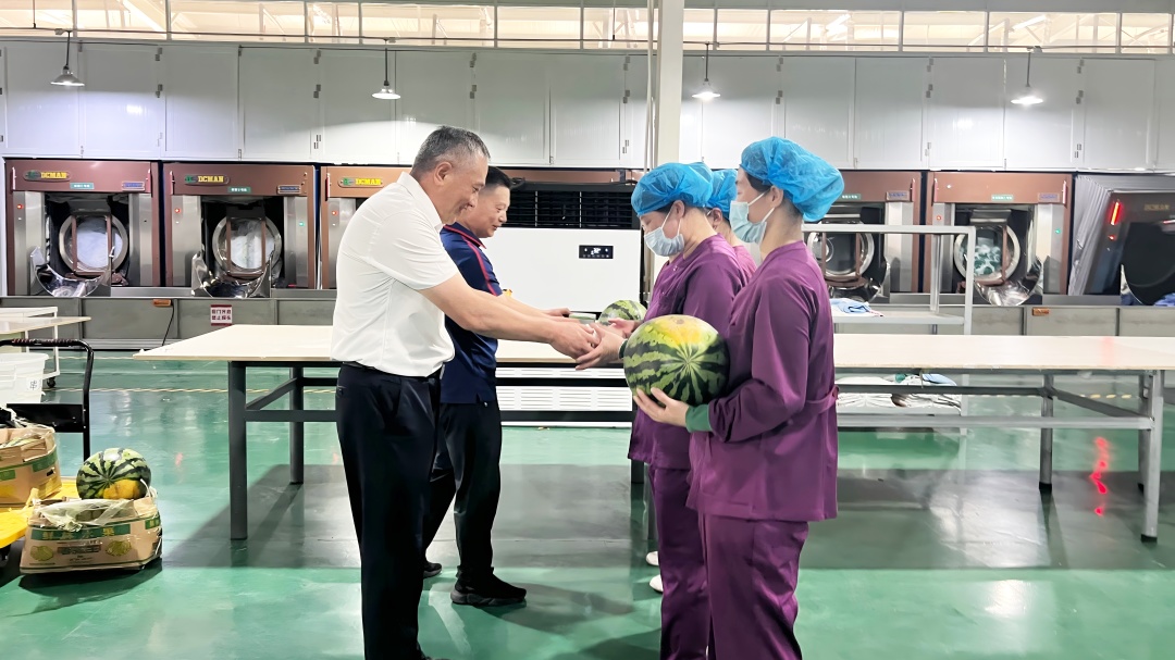 慰問團深入消毒供應中心、洗滌中心,看望奮戰(zhàn)在高溫一線的員工,將解暑物資送到大家手中,并與員工們親切交談,了解近期工作情況及高溫防護措施落實情況。對大家頂酷暑、保運轉的辛勤付出表示高度肯定。